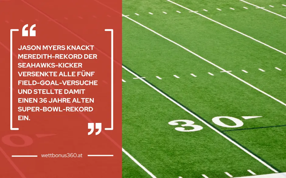 Der Seahawks-Kicker versenkte alle fünf Field Goals und stellte damit einen neuen Super-Bowl-Rekord auf. Seine längsten Versuche aus jeweils 41 Yards waren eiskalt. - Die wettbonus360-Prognose lag goldrichtig